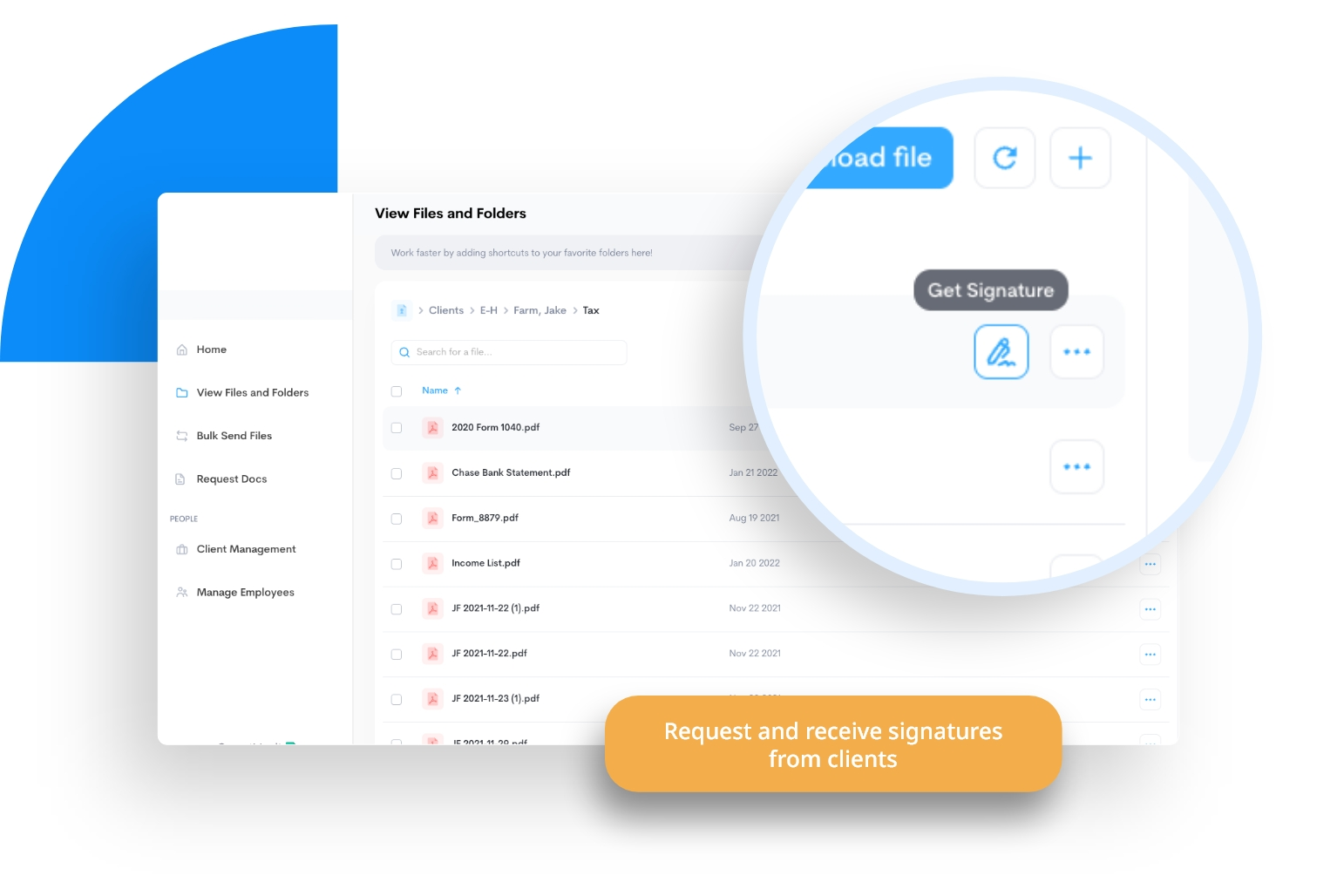 No printing, no chasing, no patchwork tools. Just a secure, integrated portal for requesting, tracking, and storing eSigned documents, built for accounting professionals.