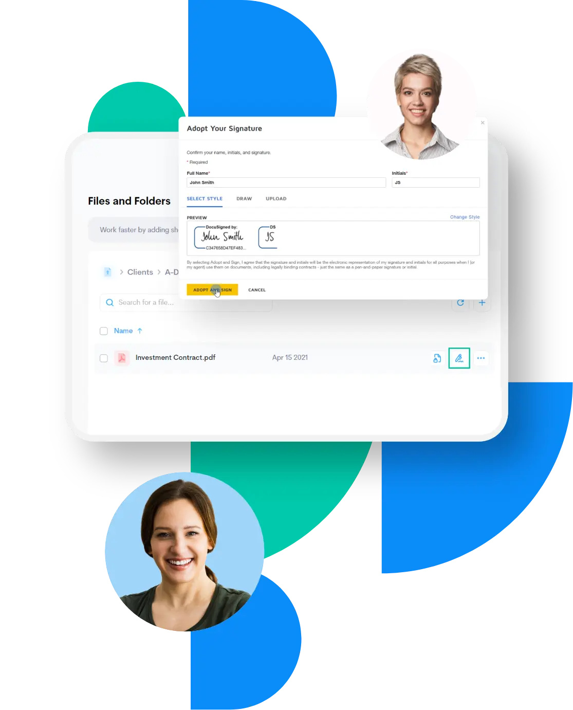 Request signatures, track progress, and store signed documents securely, all from within SmartVault. Our DocuSign integration simplifies compliance, accelerates turnaround times, and works wherever business takes you.