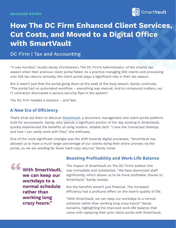 For The DC Firm, SmartVault has been more than just a DMS and client portal. By enabling efficient remote work, enhancing security, and improving client interactions, SmartVault has helped the firm increase profitability, maintain work-life balance, and provide superior service to their clients.